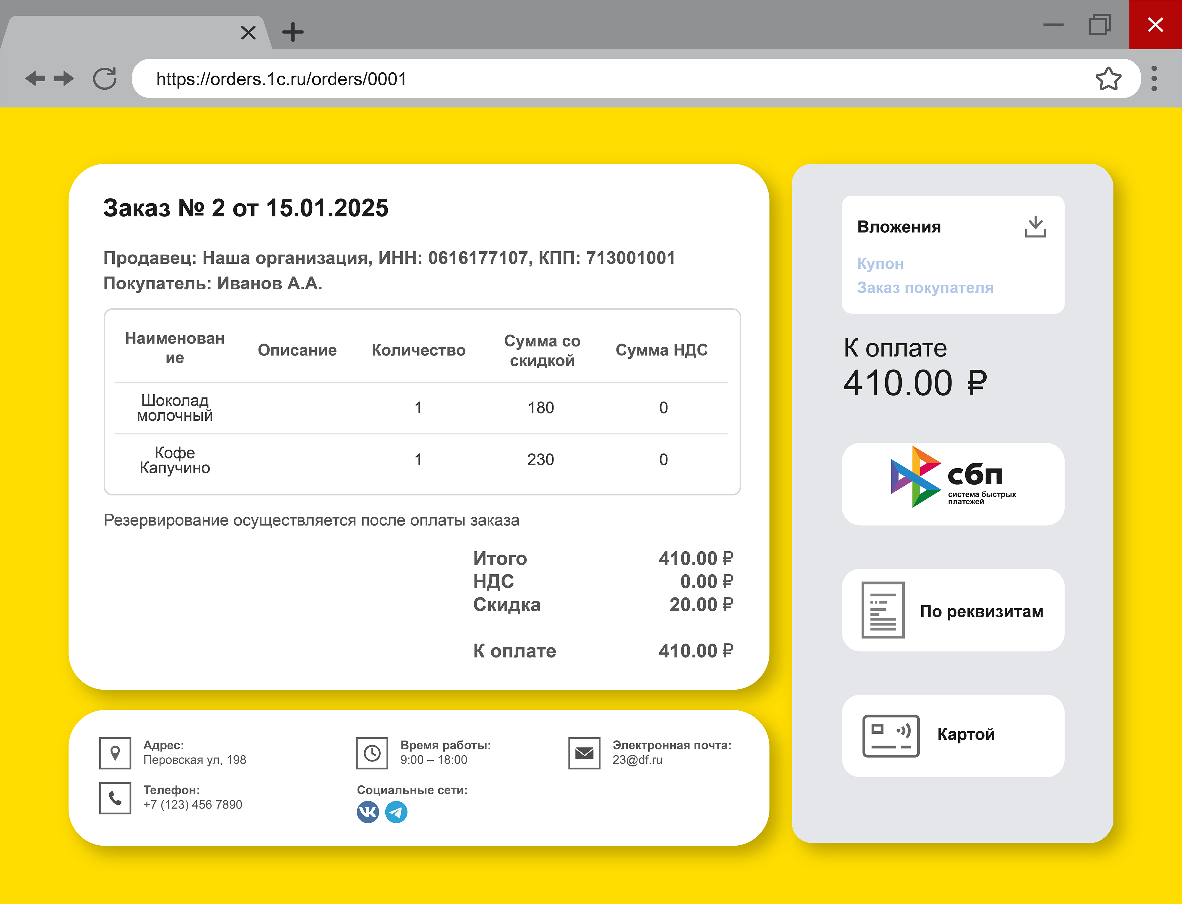 Сервис позволяет за один клик создать страницу с заказом клиента прямо из документа в программе 1С. Эту страницу можно моментально отправить клиенту (юридическому или физическому лицу) по ссылке, которую он сможет открыть в любом браузере, ознакомиться с заказом и сразу оплатить.